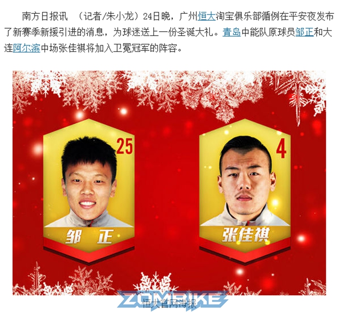 媒體對張佳祺加盟恒大的報道和恒大官網海報: