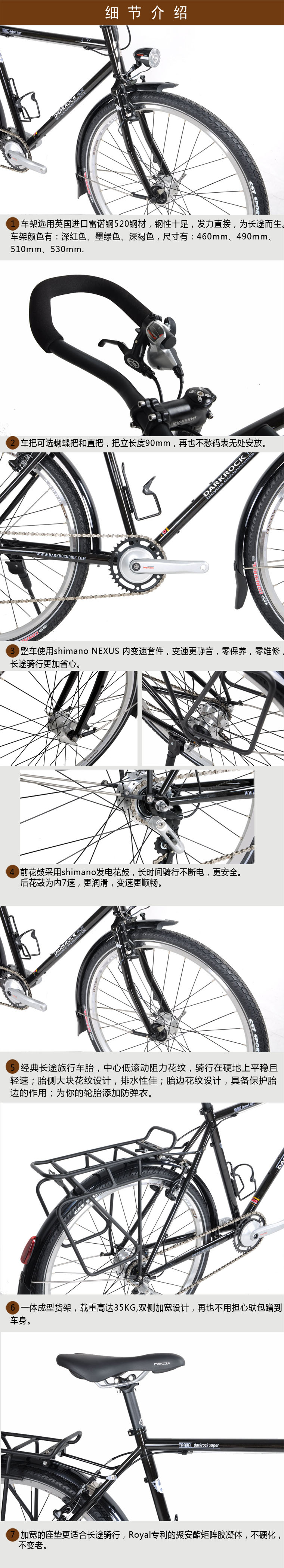 車架選用英國進口雷諾鋼520鋼材,鋼性十足,發力直接,為長途而生。內變速套件變速靜音,零保養,零維修,長途騎行更加省心