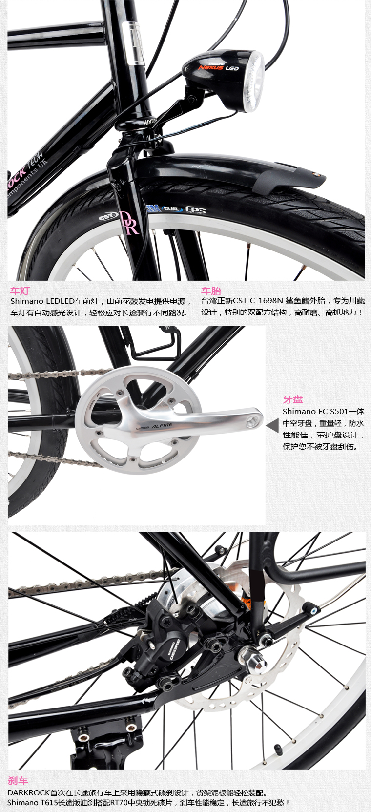 DARKROCK首款27.5寸長途旅行車,shimano 內11S變速套件,前發電車燈,搭配牛皮把套及牛皮坐墊,復古風十足。