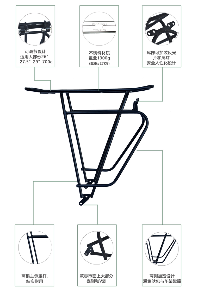 DARKROCK 不銹鋼貨架,黑色,碟剎/V剎通用,26/27.5/29大部份通用。重量1300g,限重27KG。詳情請咨詢QQ:81882299,或致電:020-85521051