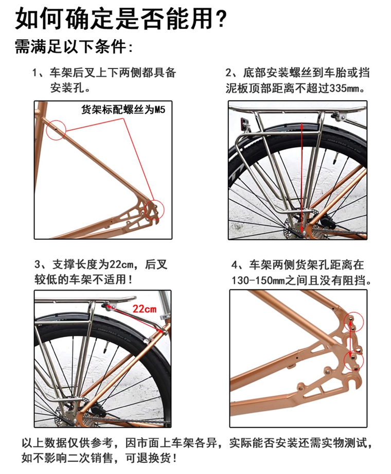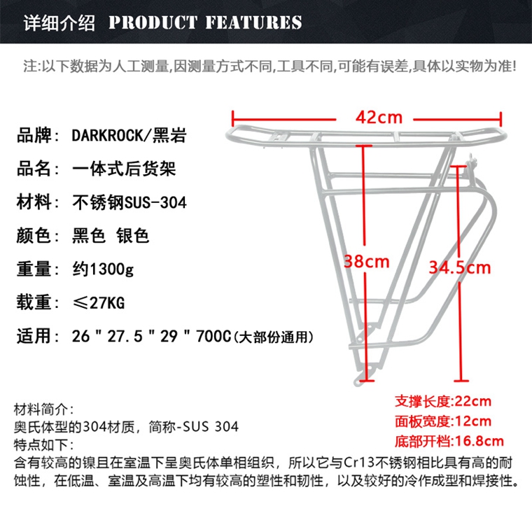 DARKROCK 不銹鋼貨架,黑色,碟剎/V剎通用,26/27.5/29大部份通用。重量1300g,限重27KG。