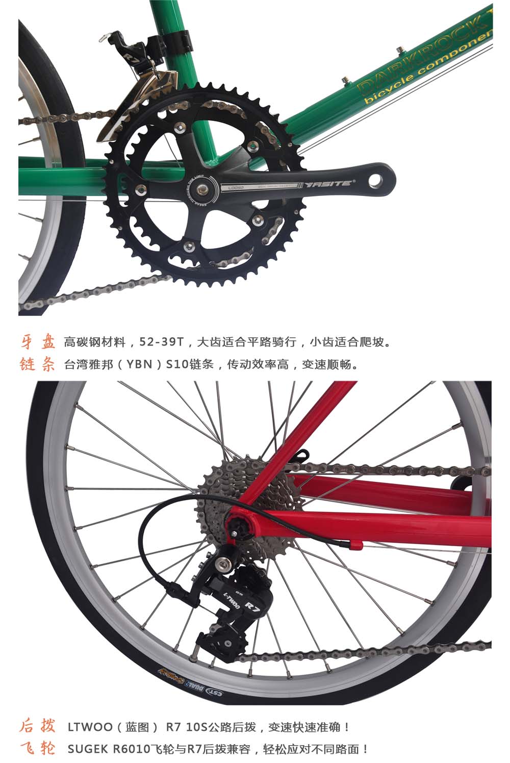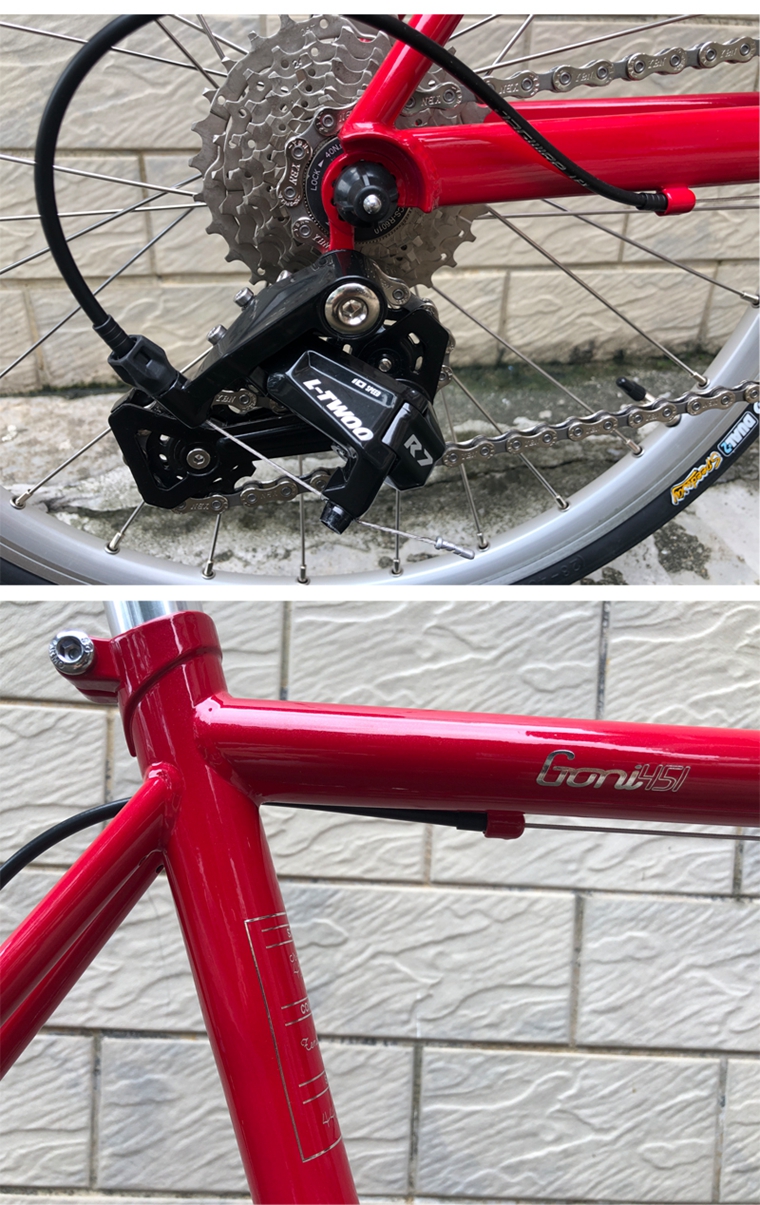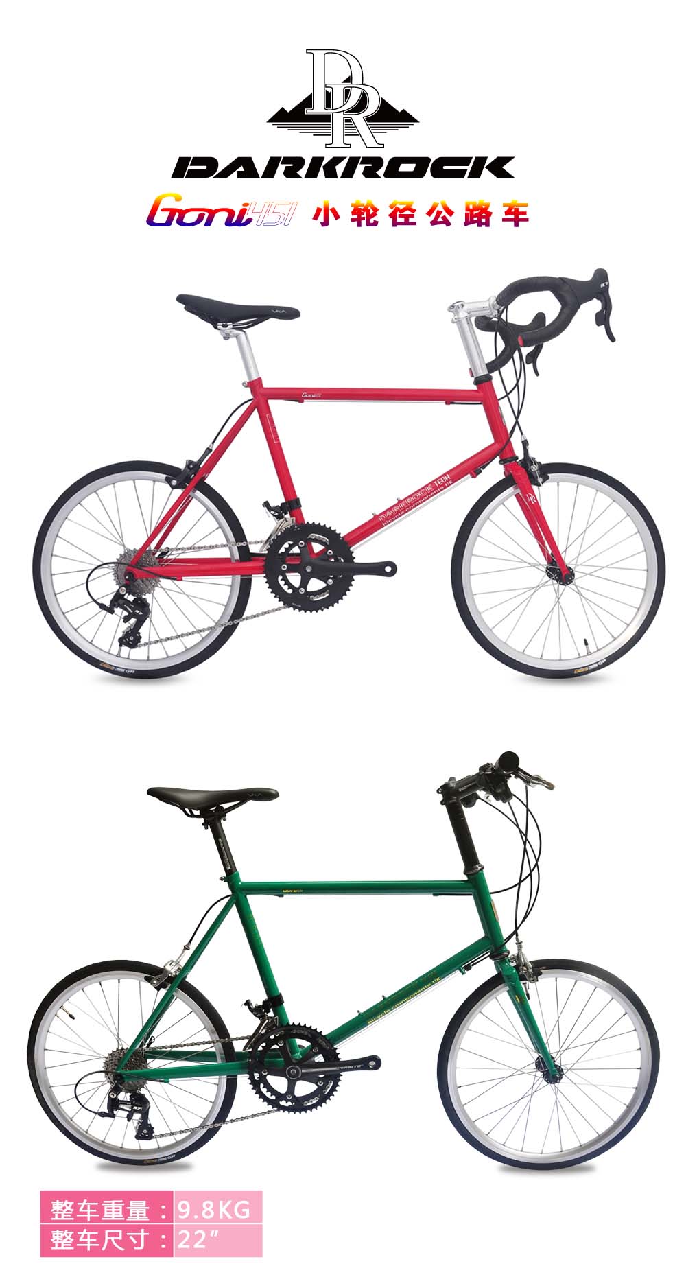 DARKROCK GONI 451小輪徑整車,藍圖R7公路套件,直把、彎把可選,進口臺灣鉻鉬鋼車架+前叉,純手工焊接技術,翡翠綠和深緋紅兩色,車架尺寸:420MM/440MM,