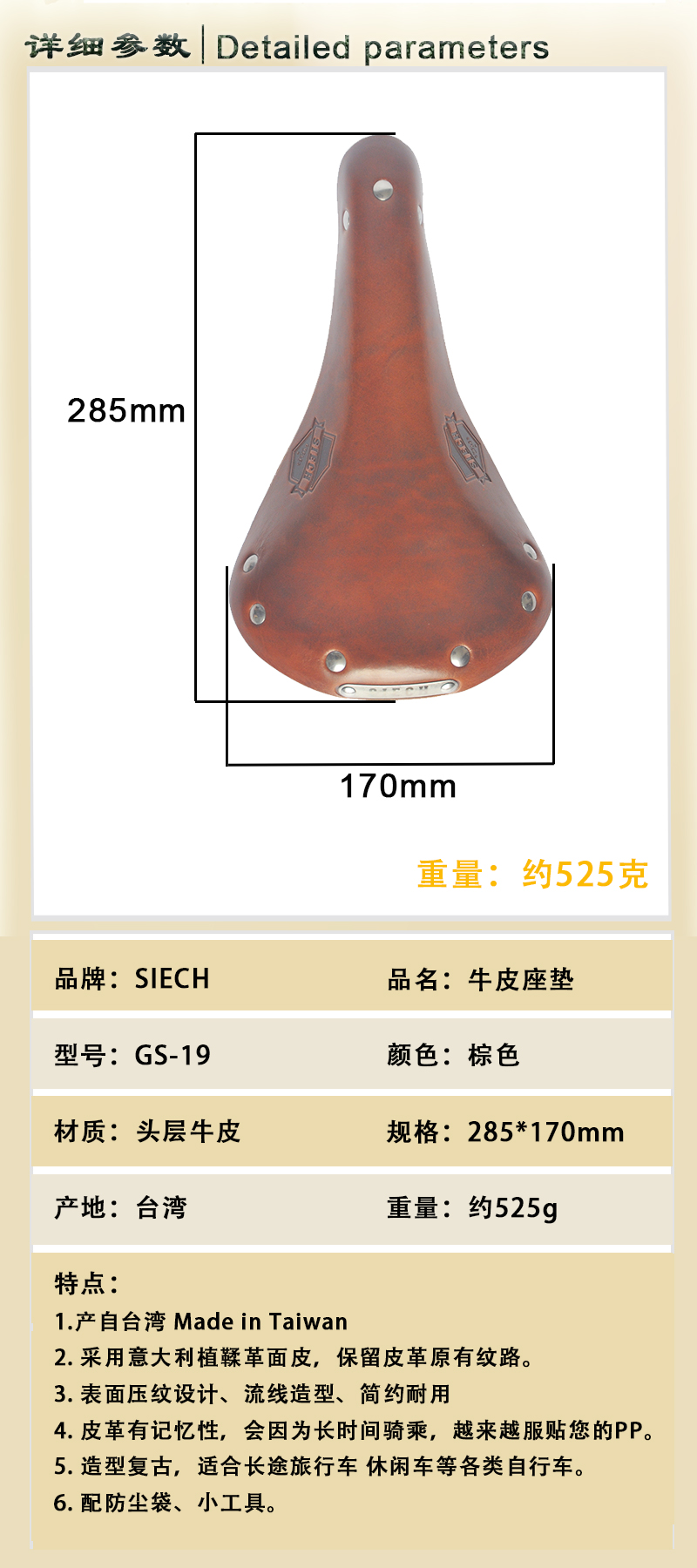 歐洲品牌SEICH牛皮坐墊長途旅行車休閑復古自行車座墊  臺灣Gyes巨業GS-19牛皮坐墊  規格:長285mm, 寬170mm 重量約525g 材質:進口牛皮 / 鋼軌 配有防塵袋1個 / 小工具2個 深棕色 臺灣巨業代工  全新正品