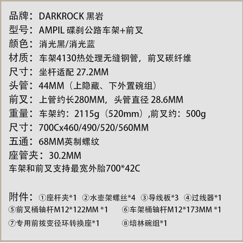 DARKROCK AMPIL 公路碟剎車架+前叉DARKROCK AMPIL 公路碟剎車架+前叉,消光黑、消光藍(lán)可選,有460MM,490MM,520MM,560MM可選,前后桶軸、內(nèi)置碟剎設(shè)計(jì)。送:前后桶軸桿、碗組、座桿夾、過線器、微調(diào)螺絲、前撥變徑環(huán)、膨脹花芯。