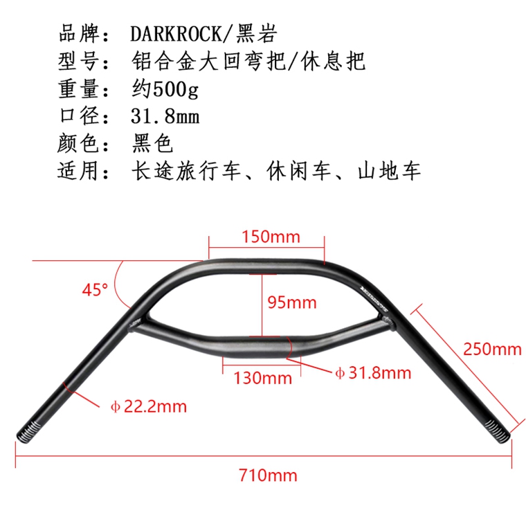 DARKROCK鋁合金大回彎把,重量約500g,口徑31.8mm,適合山地車、長途旅行車、休閑車、越野車使用。(注:標價不含把立)
