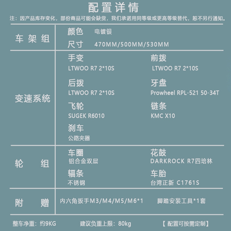 DARKROCK R-702C公路整車(藍圖R7版彎把)DARKROCK R-702C公路整車(藍圖彎把版)鉻鉬鋼車架+前叉,藍圖R7 2*10S公路套件,前2后4培林輪組,臺灣正新車胎,意大利SR舒適坐墊,更多配置可定制!